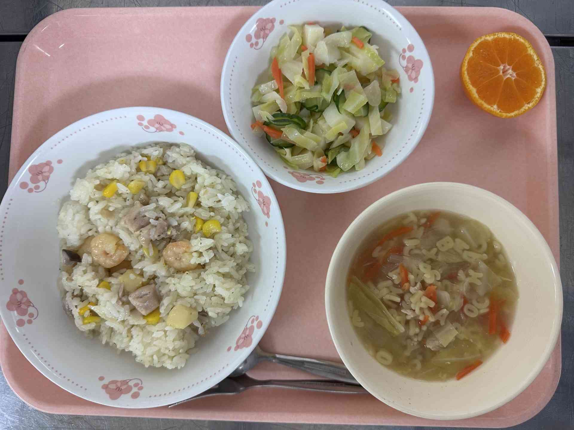 今日の給食は、「シーフードピラフ・コロコロポテトのゆで野菜・ABCスープ・花みかん・牛乳」です。 コロコロポテトのゆで野菜のドレッシングは、油と酢、はちみつ、塩、こしょうを混ぜて作りました。 花みかんの産地は、和歌山県でした。