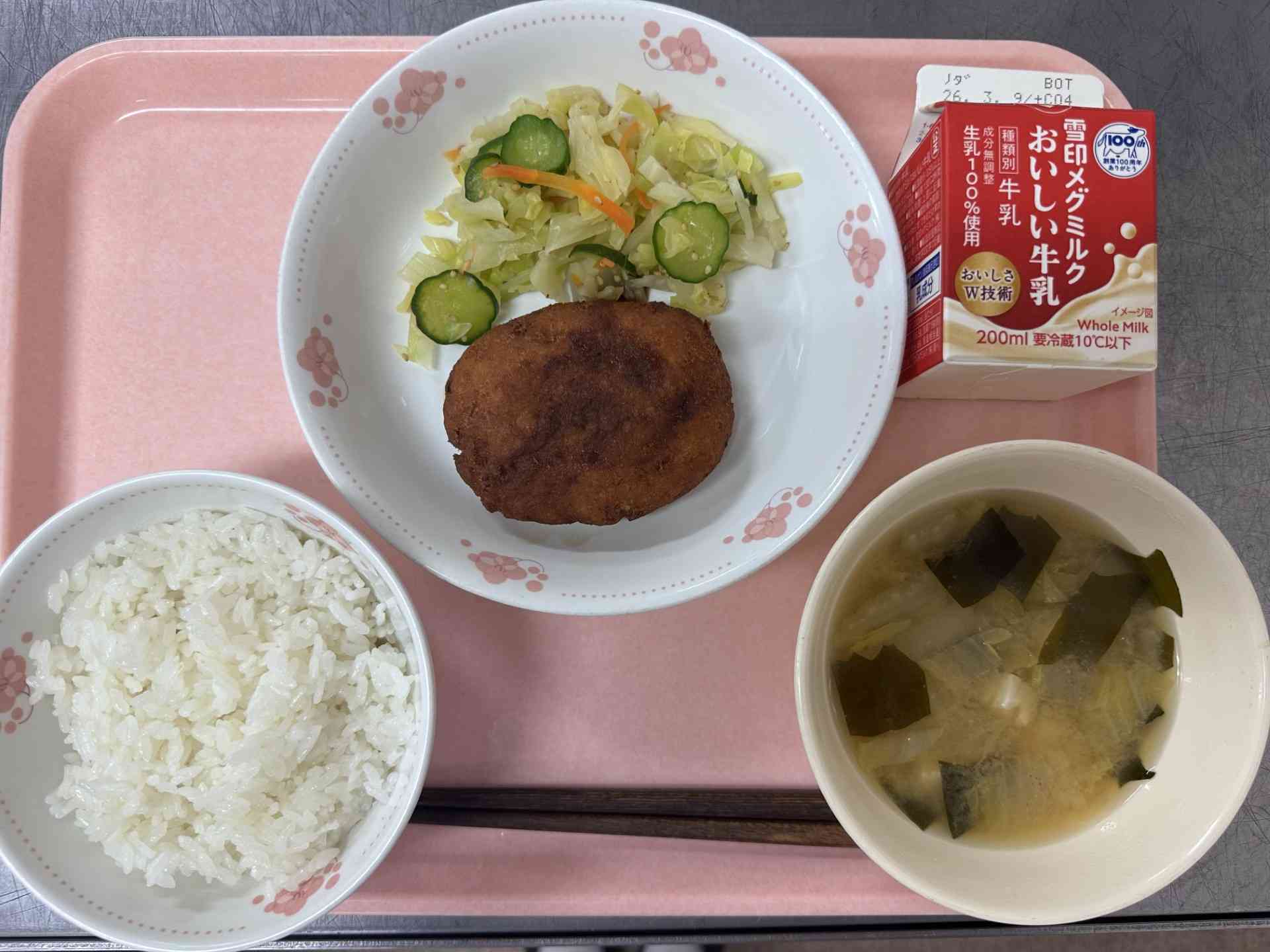 今日の給食は、「ごはん・ゼリーフライ・キャベツの香りづけ・みそ汁・牛乳」です。 今日は埼玉県の郷土料理献立です。ゼリーフライは、埼玉県行田市で昔から食べられている料理だそうです。 ゼリーフライの中身は、じゃがいもやたまねぎ、にんじん、おからに小麦粉、米粉、豆乳です。畑で収穫される食材を使った、素朴な味わいのフライです。