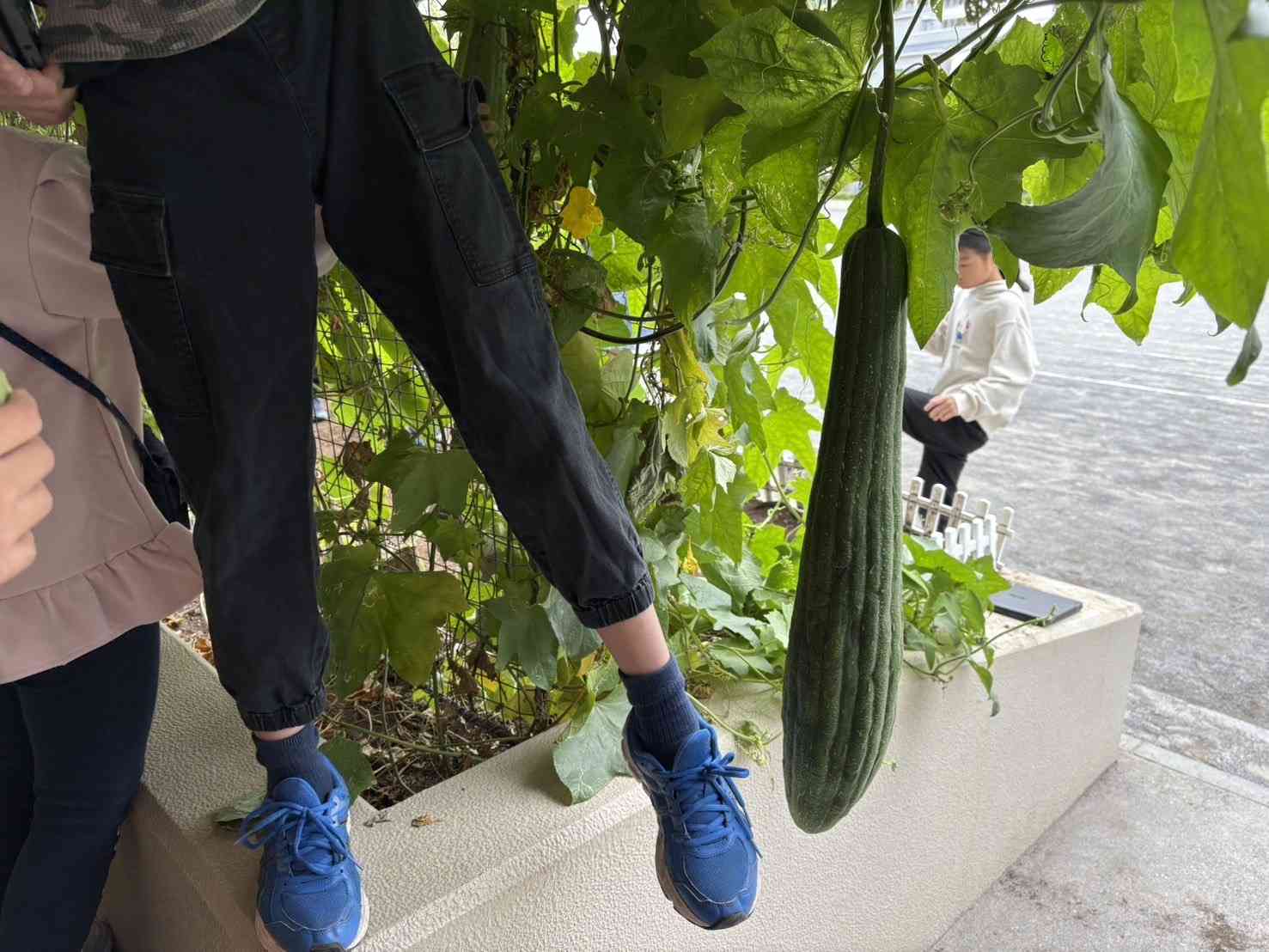 春に苗を植え、観察を続けているヘチマが とても大きく成長しています。 「足の長さと同じくらいだ!!」とその大きさに驚いていました。これから収穫をし、ヘチマたわし作りに挑戦します。