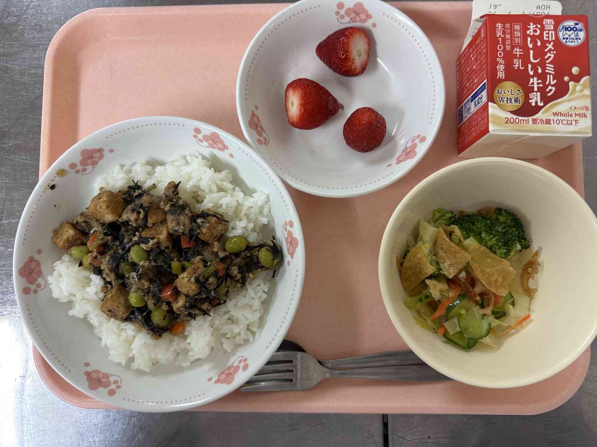 今日の給食は、「魚パオライス、根菜チップサラダ、いちご、牛乳」です。 令和7年度おいしいメニューコンクールファミリー部門の優秀賞に南央小4年生の「魚パオライス」が選ばれました。 今日は、そのメニューを給食用に少しアレンジして出しました。 今年度のテーマは、「元気なからだをつくる!育ち盛りの貧血撃退メニュー」で、鉄分が多い食材が使われているだけでなく、 ガパオライスの味付けで食べやすくなっていました。